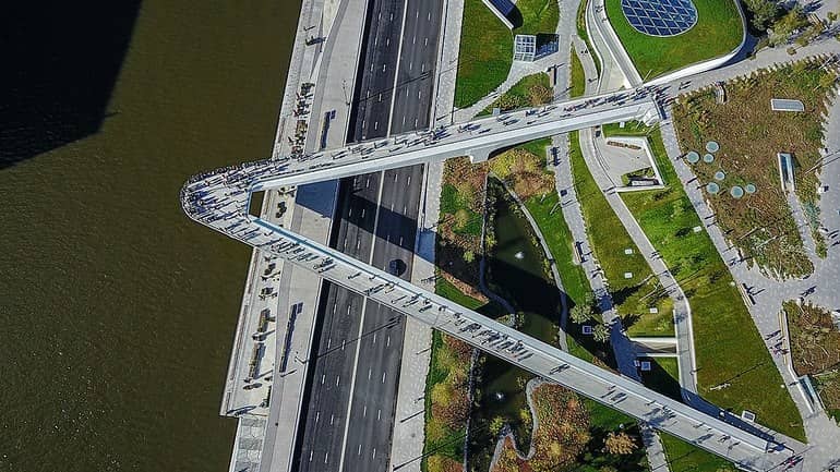 یکی از جذابیتهای پرطرفدار پارک، پل شناور بر رودخانه مسکوا است که دید خارقالعادهای نسبت به کرملین، یکی از اصلیترین جاذبههای گردشگری مسکو دارد. پل شناور، یک سازه V شکل بزرگ است که بخش انتهایی آن به صورت بالکنی بر روی رودخانه مسکوا سایه انداخته است. این سازه ۷۰ متری از آن جهت در مسکو بینظیر است که هیچ ستونی برای حمایت ندارد و توانایی تحمل نزدیک به ۲۴۰ تن معادل ۳ تا ۴هزار نفر را به صورت همزمان دارد. یکی دیگر از بخشهای جذاب پارک، فضای ۸۵۰۰ متری مدیاسنتر است که به ماشین زمان معروف است. در این بخش بازدیدکنندگان میتوانند با نشستن در مقابل مانیتورهای عظیم و پانورومیک و یا تماشای فیلمهای اینتراکتیو در زمان سفر کنند. آنها میتوانند برنامههایی همچون نبرد برودینو، آتش عظیم مسکو، اتاق مشورت فیلی و نقاط دیگر پراهمیت تاریخ روسیه را به صورت بازسازی شده و دیجیتال تماشا کنند. این سالنها با استفاده از تکنولوژی 4D سینمایی به بهترین حالت ممکن حس و حال زمانی مشخص را به شما منتقل میکنند. مدیاسنتر و سینمای چهاربعدی کمک شایانی به این پارک برای تبدیلشدن به یکی از برترین جاذبههای گردشگری مسکو بعد از میدان سرخ و کرملین کرده است. اگر علاقهای به آشنایی به تاریخ و فرهنگ منطقه «شمال دور» روسیه دارید، حتما به غار یخی پارک زریادیه سر بزنید. این منطقه یخی مصنوعی با استفاده از تکنولوژی اینتراکتیو شما را با تمام چیزهایی که باید در رابطه با شمال دور بدانید آشنا میکند. دمای هوا در این جاذبهی گردشگری مسکو در طول روز بالاتر از دو درجه زیر صفر و در طول شب به نزدیک ۵ درجه زیر صفر میرسد. همچنین در طول سال چندین و چند برنامه آموزشی در این مکان توسط سازمانهای مختلف زیستمحیطی و تاریخی برگزار میشود.