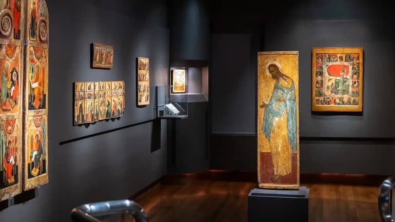 آیکنها بخش مهمی از فرهنگ مذهبی مسیحیت ارتدکس هستند و شما میتوانید نمونههای زیادی از این آیکنها را در موزههای روسیه بیابید. تا انقلاب اکتبر، هنرمندان زیادی برای نقاشی این آیکنها برای کلیساها و حتی خانههای مردم استخدام میشدند. البته در دوران حکومت شوروی بیشتر آن آیکنها در کنار کلیساها از بین رفتند و شما همچنان میتوانید نمونههای بینظیری از این هنر مذهبی را در موزههای روسیه پیدا کنید. برای مثال میتوانیم به آیکن فرشته مقرب جبرئیل که در گذشته بخشی از آیکنوستاسیس کلیسا تجلی (Transfiguration Cathedral) در تور (Tver) بوده است و در حال حاضر در اختیار موزه دولتی روسیه قرار دارد اشاره کنیم. شما میتوانید در هنگام بازدید از این موزه در خلال برنامههای سفر به روسیه از این آیکن که در اواسط قرن پانزدهم کشیده شده است دیدن کنید. این آیکن در یکی از سالنهای قصر میخایلوفسکی (MIkhailovsky Palace) قرار دارد که بخشی از تور گردشگری سنت پترزبورگ است.